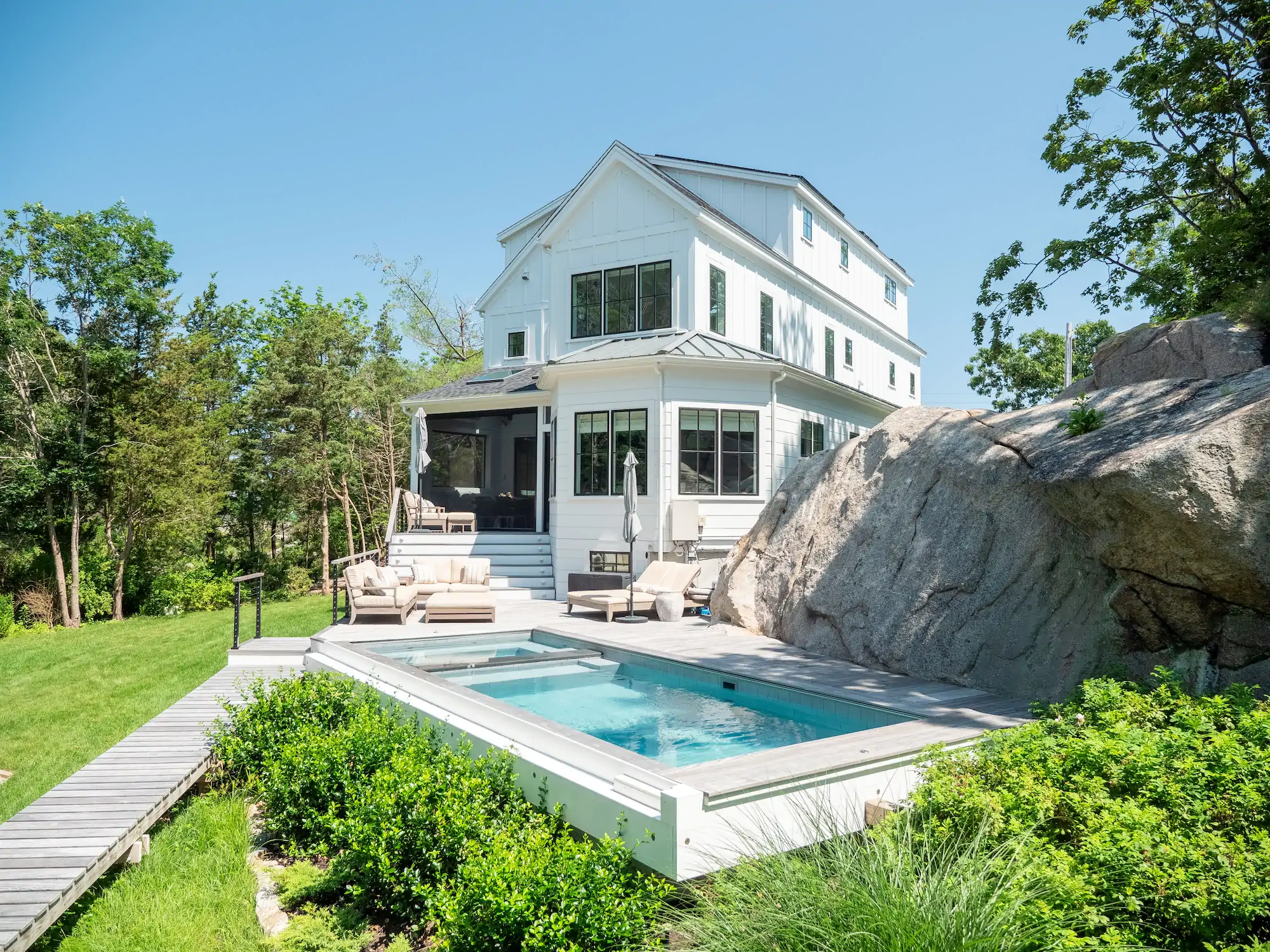 Available in carefully proportioned configurations from The Nantucket (7′ x 13′) to The Cape (9′ x 21′) layouts with integrated spa features, each Plunge Pool Concepts installation can be customized to reflect your specific requirements and aesthetic preferences.